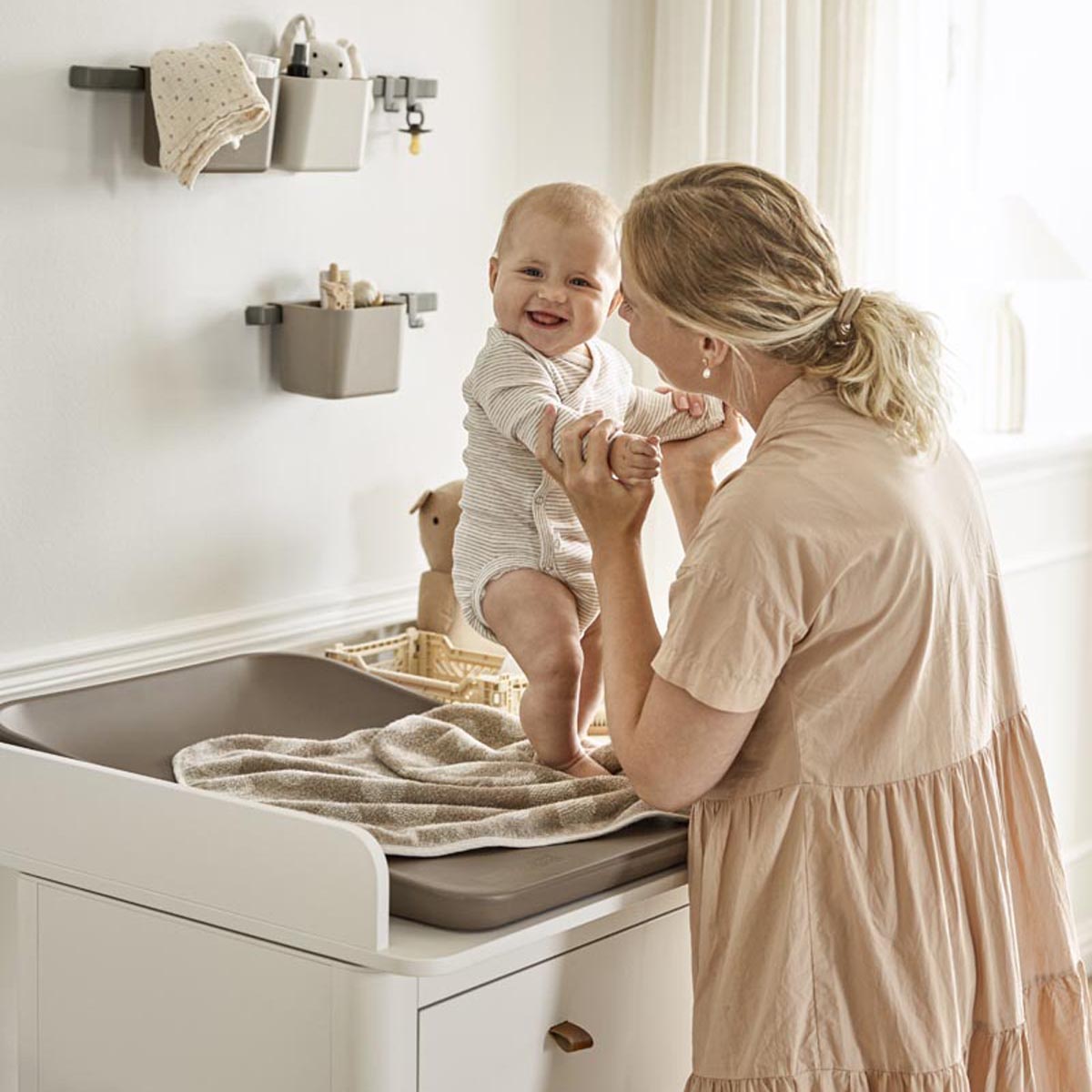 In a small apartment, a large changing table might not fit. Opt for a flexible changing mat that works on any stable surface - table, floor, wall or dresser. The Leander Matty™ mat has a firm, laminated wooden back for added stability. Take a look at our changing solutions to suit your needs.